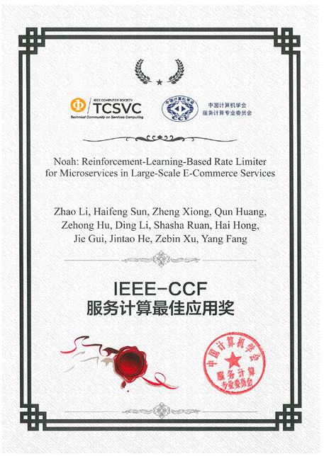 北京大学计算机学院黄群课题组近年面向数据中心与云计算,对网络测量、网络系统评估与优化等方向开展了深入研究,取得了系列研究成果。其中一项研究成果,在智能系统领域顶级期刊IEEE TNNLS(IEEE Transactions on Neural Networks and Learning Systems,影响因子10.4)上发表的论文“Noah: Reinforcement-Learning-Based Rate Limiter for Microservices in Large-Scale E-Commerce Services“,于2024年9月13日获得IEEE-CCF服务计算最佳应用奖。该研究成果是和阿里巴巴-浙大前沿技术研究中心李朝团队合作完成,阿里巴巴李朝博士与计算机学院21级博士生孙海锋(导师黄群)为共同第一作者,黄群为通讯作者,同时参与该研究的还有计算机学院21级博士生桂杰、贺锦涛(导师黄群)。成果中的多项技术(如轻量级系统监测、智能调度)已经部署服务超过5万个容器与300多个应用,将相关硬件成本降低22%,QPS提升230%。