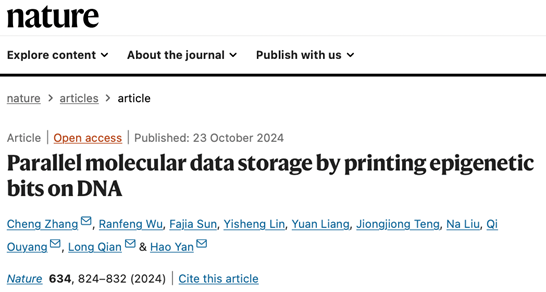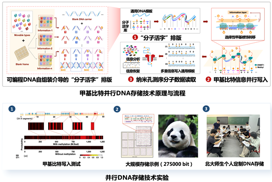 2024年10月23日,北京大学计算机学院-张成与定量生物学中心-钱珑联合研究团队与合作者,在国际学术期刊 Nature 上发表题为“Parallel molecular data storage by printing epigenetic bits on DNA” (https://www.nature.com/articles/s41586-024-08040-5)的研究论文,首次提出了一种基于并行写入策略的DNA存储方法。该技术不依赖于主流的“从头合成”写入路线原理,通过DNA自组装与选择性酶促甲基化的组合原理,可将“表观比特”(epi-bit,5-甲基胞嘧啶)编码的数字信息并行打印在DNA分子上。同时,研究中还成功实现了个人订制DNA存储示例,证明了便捷的分布式DNA存储应用潜力。该方法的建立,不仅为实现了快速、低成本的大规模分子数据存储奠定了技术基础,还为未来DNA存储的发展提供了全新思路。