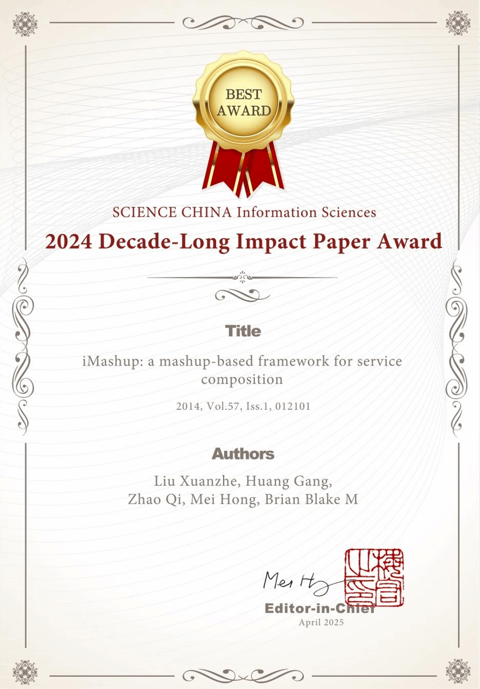 2025年4月30日,权威期刊SCIENCE CHINA Information Science(《中国科学:信息科学》)官方公布了2024年优秀论文评选结果。计算机学院刘譞哲教授作为第一作者发表于2014年的论文《iMashup: a mashup-based framework for service composition》获评该期刊2024年度“十年持续影响力”论文奖(Decade-Long Impact Paper Award)。