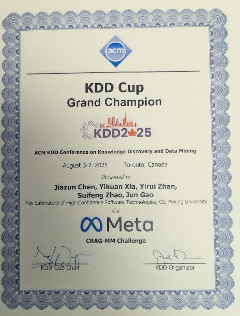 在2024年囊括Meta KDD Cup 24 CRAG三个任务全部冠军的基础上,近日,北京大学计算机学院数据科学与工程所高军教授指导的博士研究生陈嘉尊、夏逸宽、詹宜瑞、赵穗丰组成的DB3队伍,联合华为2012实验室姜伟鹏、张朝瑞、韩伟、白铂等技术专家,在Meta KDD Cup 25 CRAG-MM(Comprehensive RAG Benchmark for multi-modal multi-turn question answering)比赛中,成功蝉联总分第一名。面对相比去年提升的技术难度和更加激烈的竞争环境,团队在三个核心任务中分别获得第2名、第2名和第1名的优异成绩,综合排名第一,并在真实图片数据集评测中荣获Grand Prize特别奖项。
