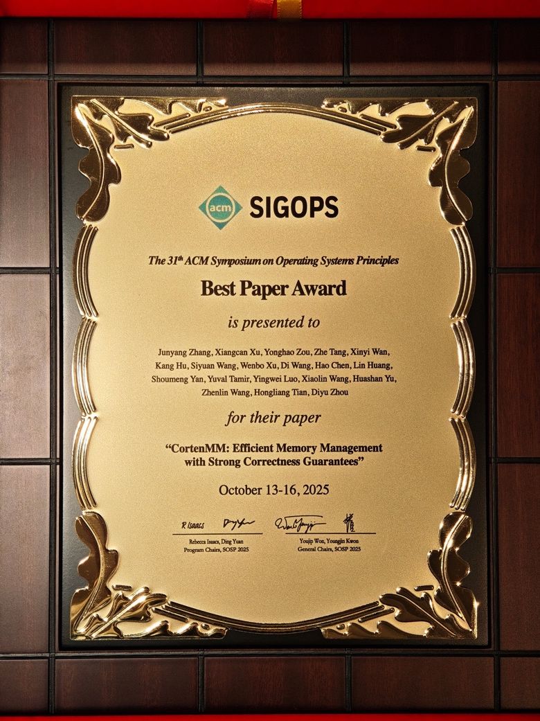 CortenMM: Efficient Memory Management with Strong Correctness Guarantees, Junyang Zhang, Xiangcan Xu, Yonghao Zou, Zhe Tang, Xinyi Wan, Kang Hu, Siyuan Wang, Wenbo Xu, Di Wang, Hao Chen, Lin Huang, Shoumeng Yan, Yuval Tamir, Yingwei Luo, Xiaolin Wang, Huashan Yu, Zhenlin Wang, Hongliang Tian, and Diyu Zhou, Proceedings of the 31st ACM Symposium on Operating Systems Principles (SOSP ’25), Seoul, Republic of Korea, Pages 1082-1098, October 2025