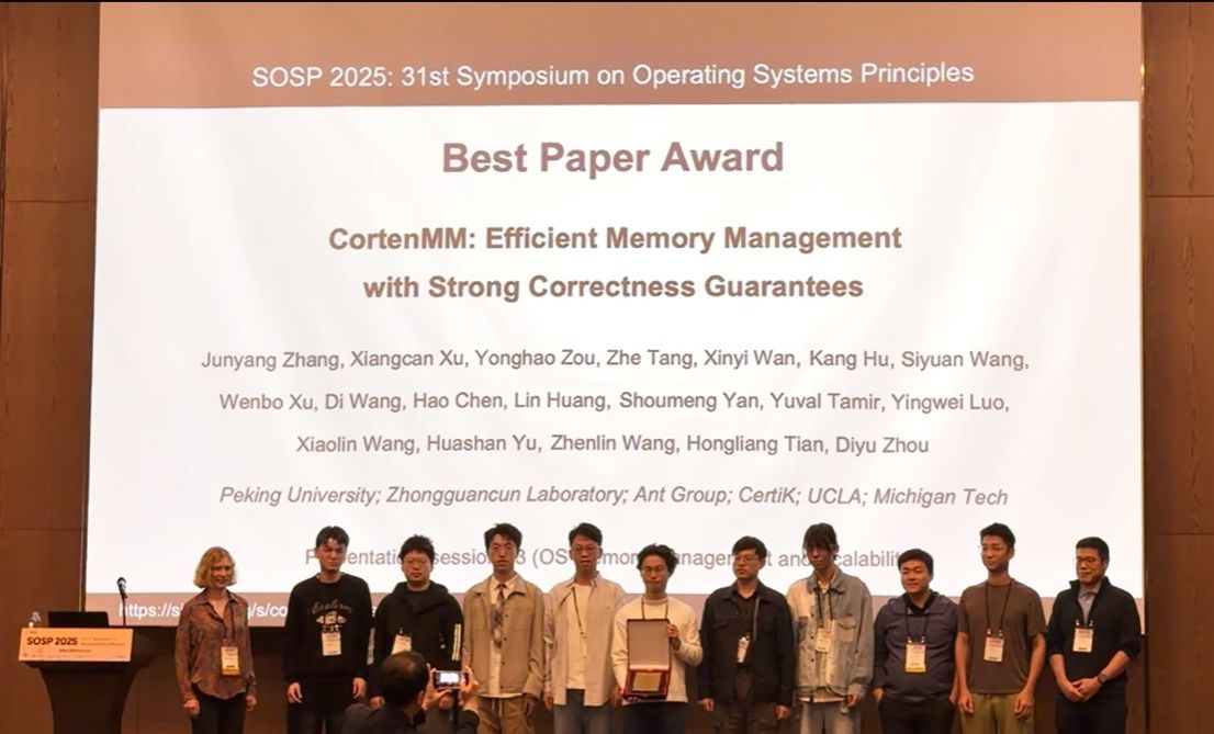 在刚刚结束的第31届ACM操作系统原理大会(SOSP 2025)上,北京大学计算机学院网络与高能效计算研究所周迪宇、汪小林、罗英伟教授团队关于内存管理——操作系统中最核心的模块——的工作《CortenMM: Efficient Memory Management with Strong Correctness Guarantees》荣获最佳论文奖(Best Paper Award)