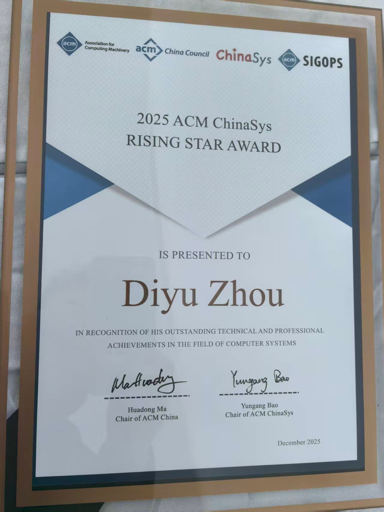 在刚刚结束的第二十九届ChinaSys研讨会上,北京大学计算机学院周迪宇老师获2025年度年度ACM ChinaSys“新星奖”(全国3人),北京大学计算机学院校友(2022届博士)、现任浙江大学百人计划研究员卢丽强老师同样获此殊荣,其他获奖者为上海交通大学的陈游旻老师。