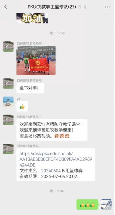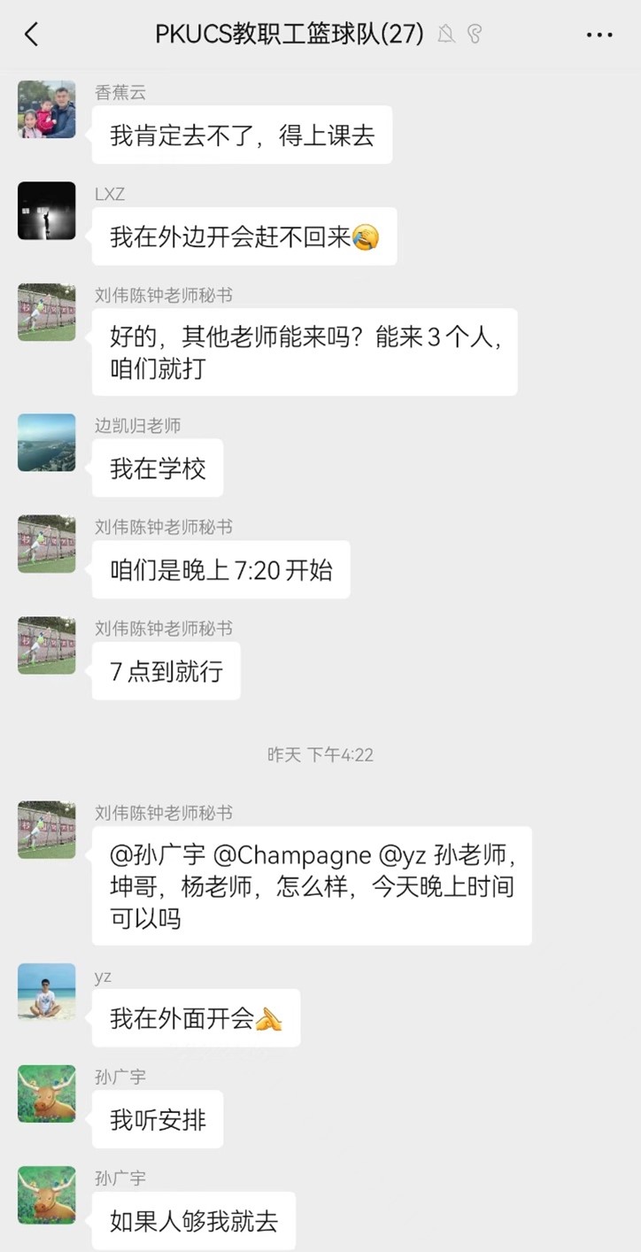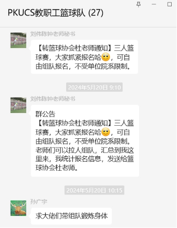 在赛事筹备之初,工会文体委员刘伟建立了一个微信群:PKUCS教职工篮球队,邀请学院打篮球的老师们都加入到这个大家庭。这个微信群不仅是一个沟通的平台,更是一个互相鼓励、加油打气的“能量源”!
