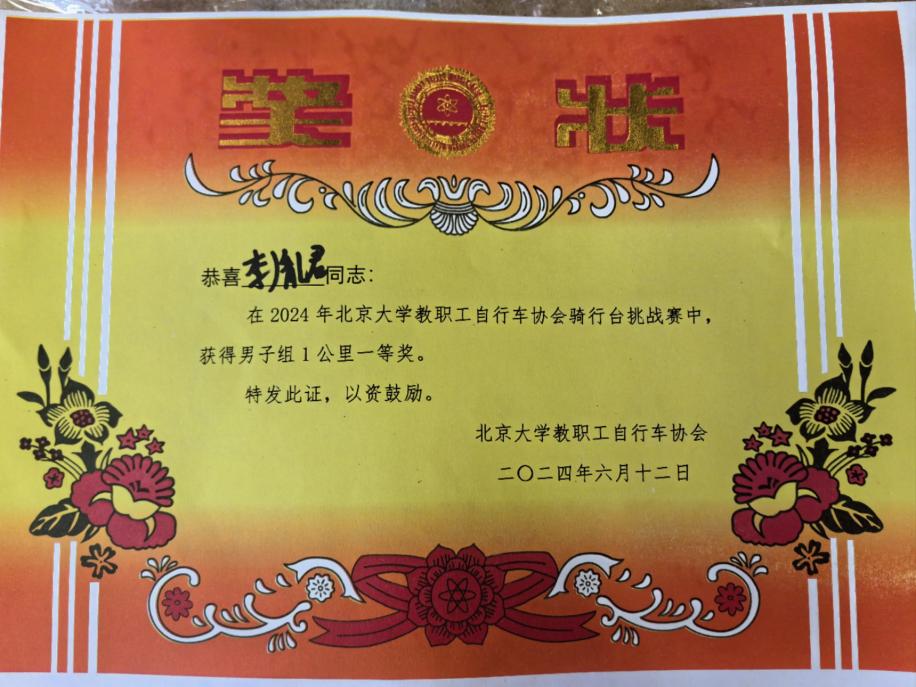 李胤君:非常荣幸能在北京大学教职工自行车骑行台挑战赛中荣获一等奖,这不仅是对我个人努力的肯定,更是协会老师们支持与鼓励的成果。感谢学校提供如此精彩的平台,让我们在竞技中享受运动的乐趣,增进同事间的友谊。这份荣誉将激励我继续前行,倡导健康生活