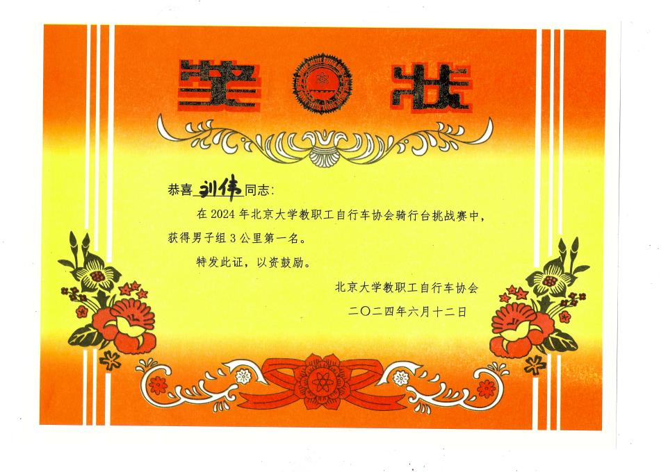 刘伟:荣幸参加2024年春季学期北京大学教职工自行车协会骑行台挑战赛,这不仅是一场速度与耐力的较量,更是团队精神的闪耀。在轮下飞驰的每一秒,都凝聚着对健康的追求和对生活的热爱。能够参与其中,我已深感满足。若有幸获奖,这将是对我坚持与努力的最好肯定,也将激励我继续前行,在生活的赛道上不断探索与超越。感谢协会的组织,感谢队友的鼓励,让我们携手共进,为健康骑行,为美好生活加油!