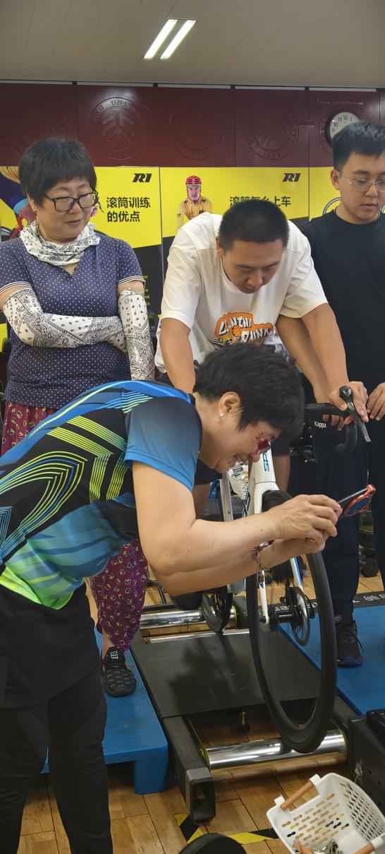 比赛开始前,卢福泉老师介绍滚筒动态骑行台系统,讲解骑行过程中身体体能变化和力量分配,重点强调安全及注意事项。讲解结束后,参赛选手挑选自行车,检查车辆打气,调整车座,上车试骑,学习骑行台操作。