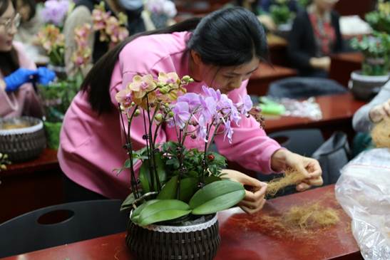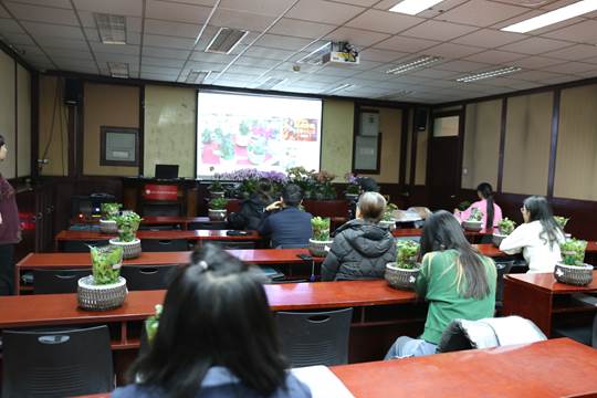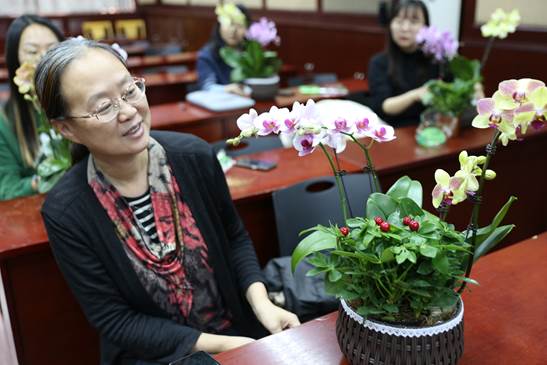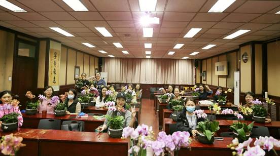 活动伊始,工会副主席刘旭东老师热情地欢迎大家的到来,看到老师们对鲜花的喜悦之情,溢于言表,他表示,以后会多多开展此类活动。接下来,由此次活动的主要策划人工会女工委员王昭老师简要介绍了此次活动的目的和流程。为了让老师们对花卉制作有更直观的了解,她特意准备了一段关于如何进行花卉制作的教学视频。视频中,一位资深花艺师详细介绍了蝴蝶兰的养殖方式以及制作组合盆栽的相关方法。老师们聚精会神地观看,不时发出赞叹之声,对蝴蝶兰的优雅姿态和组合盆栽的创意之美表现出了极大的兴趣。