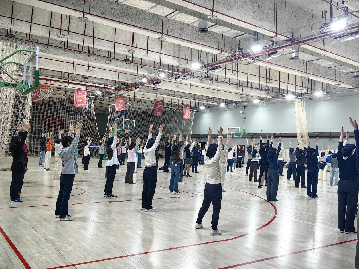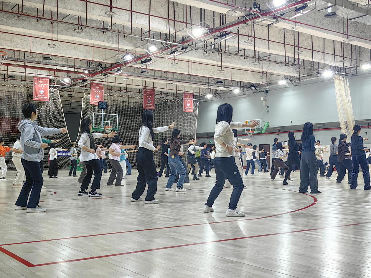 排练工作已经开展了两天,在邱德拔地下二层体育馆进行。体教部多位老师参与教授动作和指导工作。每位小教员认真学习,积极训练,目前已经可以开始配合音乐进行整体连贯动作。