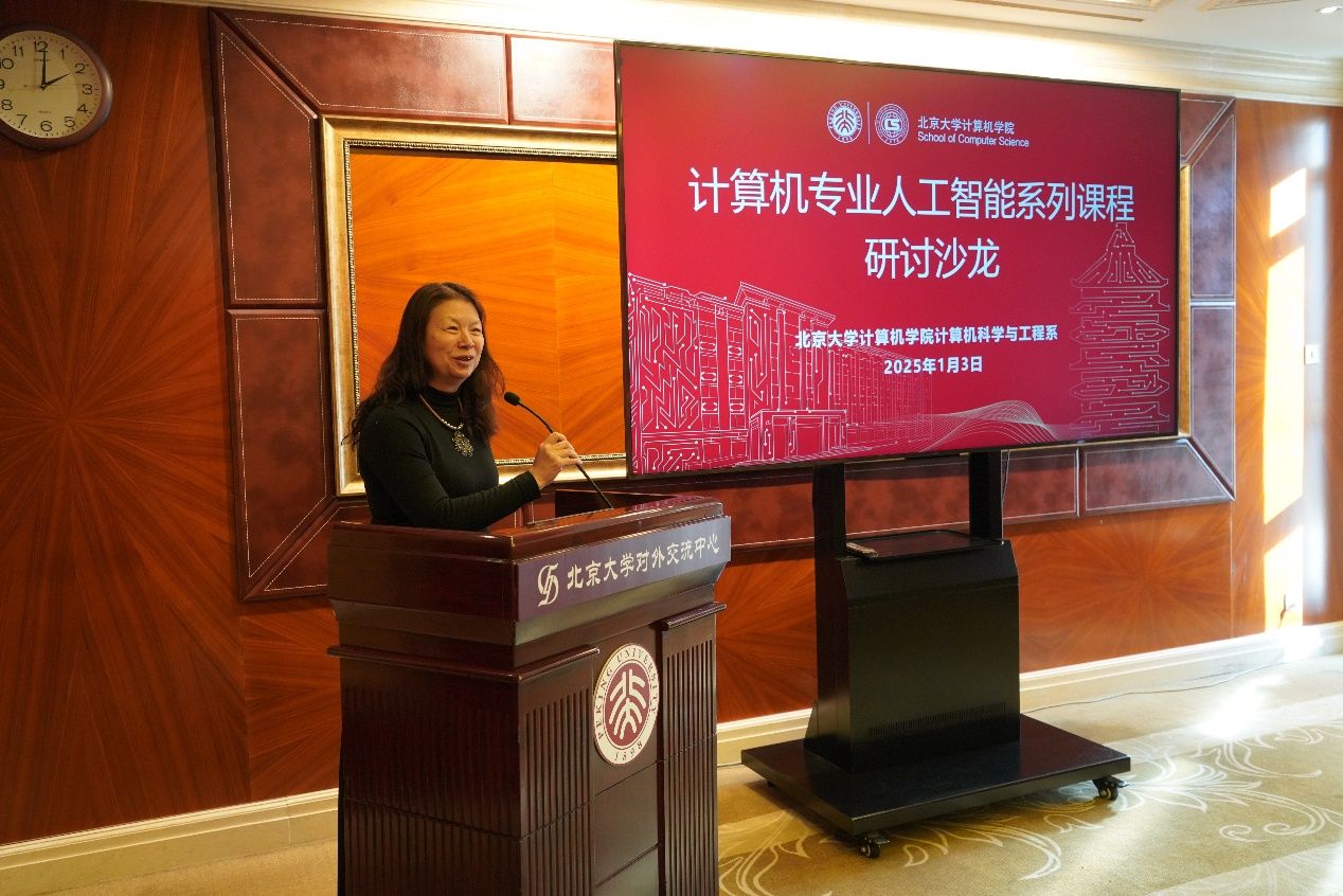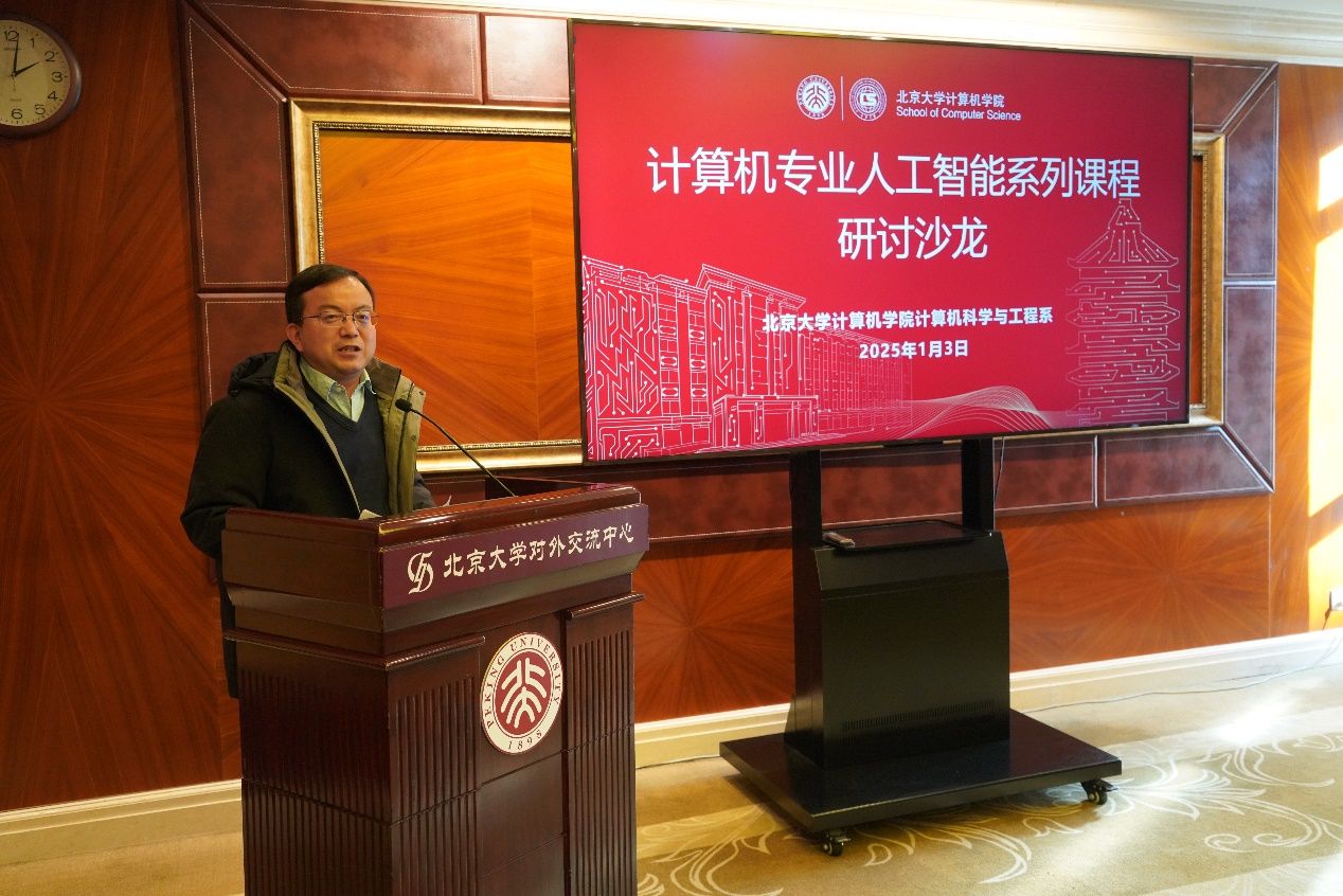 计算机学院副院长郭耀教授代表计算机学院致辞。他表示,北京大学作为最早将人工智能课程调整到大一下学期的少数高校之一,在人工智能课程建设方面走在了前列。计算机学院与信息科学技术学院联合开设了一系列人工智能相关课程,旨在让学生全面理解并掌握人工智能的整套知识体系。期待今天的讨论能帮助开课老师相互了解课程内容,理顺课程之间的内在联系,去除重复内容,发现和填补技术空白,形成内容连贯统一、覆盖全面的系列课程。