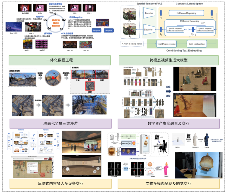 近期代表性工作:于国产化算力平台搭建一体化数据工程,同时基于多模态学习及条件扩散模型提出跨模态视频生成大模型,助力沉浸式文旅内容生成;球面化重构全景内容,集成沉浸式三维漫游;基于自适应内容补全、三角划分、网格变形等技术,实现数字资产虚实融合及平台交互;研发沉浸式场景制作系统,实现沉浸式古画长卷场景的快速制作,打破沉浸式内容多人多设备交互局限;基于触觉交互、三维分割、多模态大模型技术,实现对文物的多模态智能呈现。