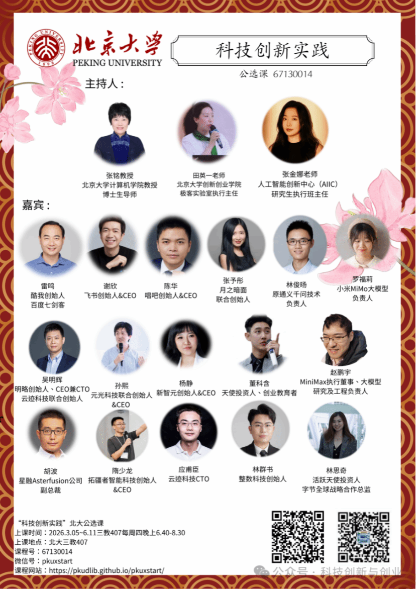 2026年春季课程重磅集结十余位定义行业的实战派领袖:从奠定互联网基础的百度七剑客之一、酷我音乐创始人雷鸣,到专注早期投资与创新孵化、曾助力超600家初创企业的天使投资人、创业教育者董科含;从打造亿级效率平台的飞书创始人、CEO谢欣,到掀起AI应用浪潮的 Kimi联创张予彤;从深耕企业智能的明略科技创始人兼CEO、云迹科技联合创始人吴明辉,到驱动AGI前沿的当红独角兽MiniMax执行董事、大模型研究负责人赵鹏宇 ,以及小米MiMo大模型负责人罗福莉等多位顶尖导师。欢迎广大校友莅临交流。